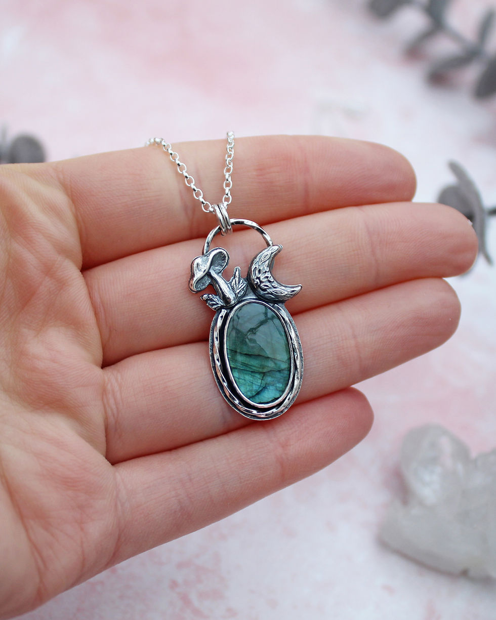 Labradorite Mushroom and Moon Sterling Silver Necklace